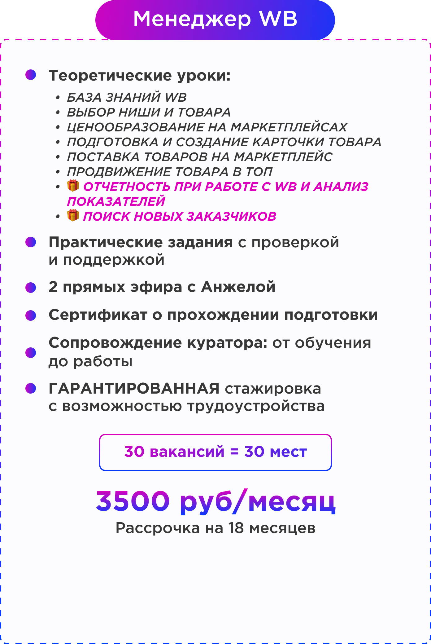 В результате: Научишься просчитывать рентабельность и устанавливать оптимальную цену на товар. Сможешь настраивать цены в личном кабинете и работать с акциями на WB.